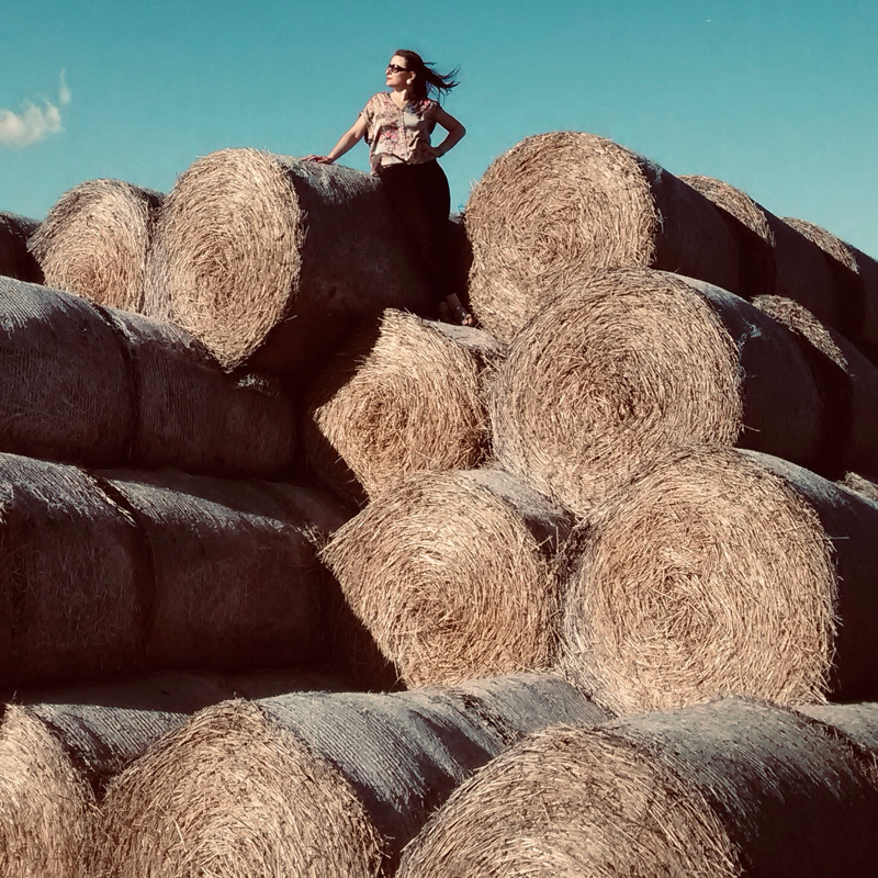 I stand atop a pile of freshly cut hay, with the wide, open sky stretching above. The image captures a moment of freedom and contemplation.